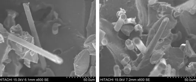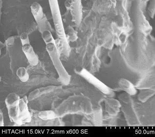 由下圖可知,未添加POE-g-MAH的PA66體系中,玻纖與樹(shù)脂之間有良好的結(jié)合,其玻纖上有明顯的尼龍樹(shù)脂的包覆。
