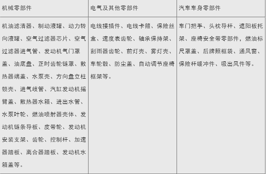 目前在汽車行業(yè)已經(jīng)應(yīng)用了該材料的零部件有機(jī)油濾清器、制動(dòng)液罐、汽車過濾器芯片、空濾器進(jìn)氣管等,如下表格所示: