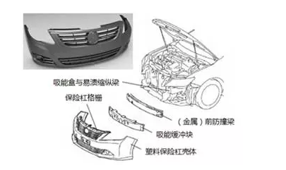 以行人腿部遭受撞擊為例,據(jù)歐洲運(yùn)輸安全學(xué)會(huì)的車(chē)輛安全專(zhuān)家分析,要減少對(duì)行人腿部的傷害,需要保險(xiǎn)杠在撞擊時(shí)有50~75mm的變形量,以吸收撞擊時(shí)的能量,這就要求塑料汽車(chē)保險(xiǎn)杠的柔軟度更高,并且在保險(xiǎn)杠、引擎蓋等部位要安裝可變形的泡沫塑料,因此汽車(chē)保險(xiǎn)杠除了外殼需由塑料制成外,安裝在其上的格柵也多由塑料制成,殼體內(nèi)部還襯有吸能緩沖材料(多為泡沫塑料)。
